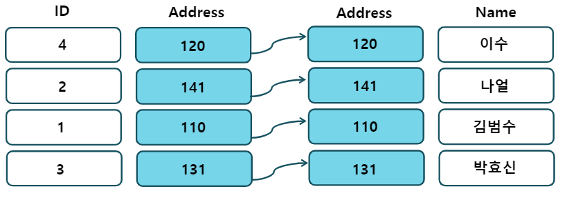 https://gwang920.github.io/database/clusterednonclustered/ 테이블의 ID 키 값과 포인터인 Address를 통해 실제 데이터에 접근합니다.