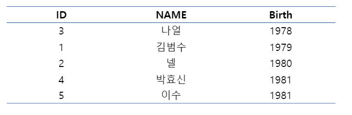위의 Table을 Birth를 기준으로 Clustered Index를 생성한다면 다음과 같은 테이블이 생성됩니다.