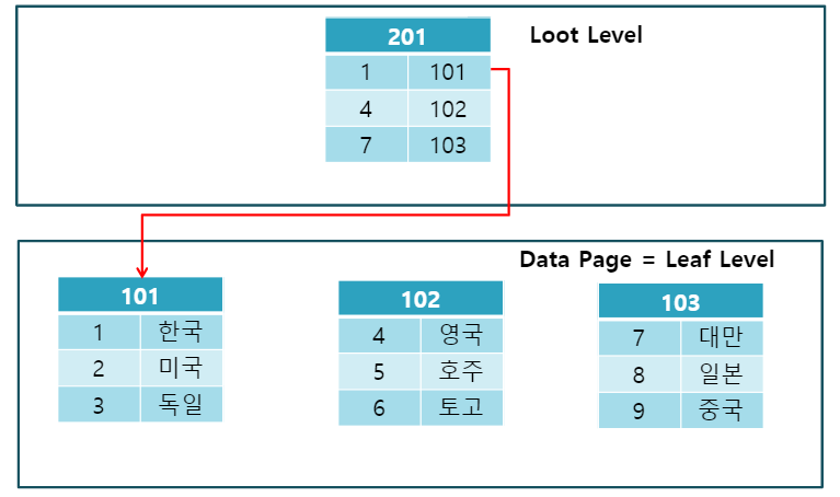 Data Page의 데이터들이 순차적으로 정렬되어 있으며 Leaf Level과 DataPage가 동일한 구조를 가집니다.