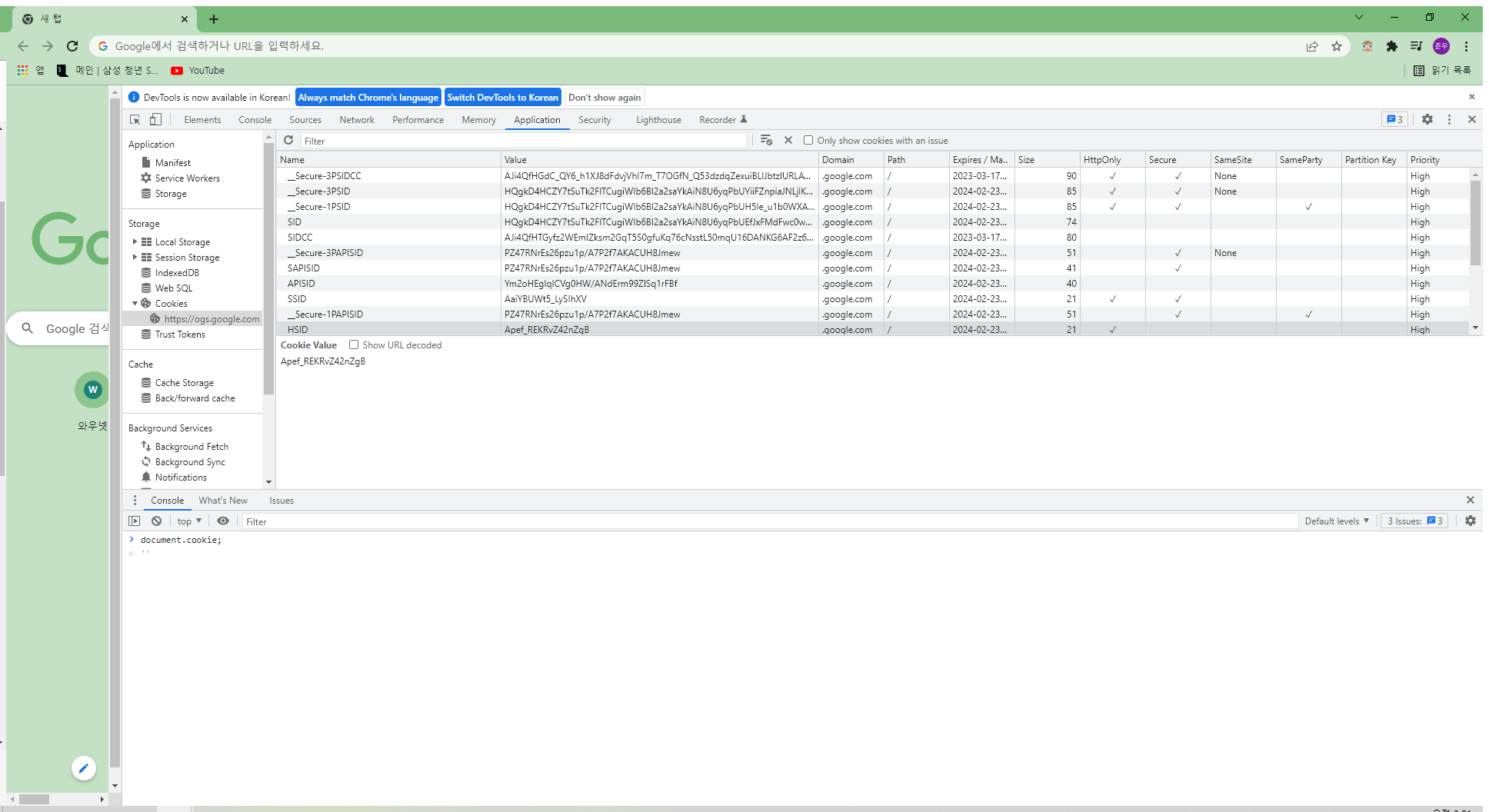 F12로 개발자 모드를 켜고 document.cookie를 하면 현재 쿠키 정보가 나옵니다.
