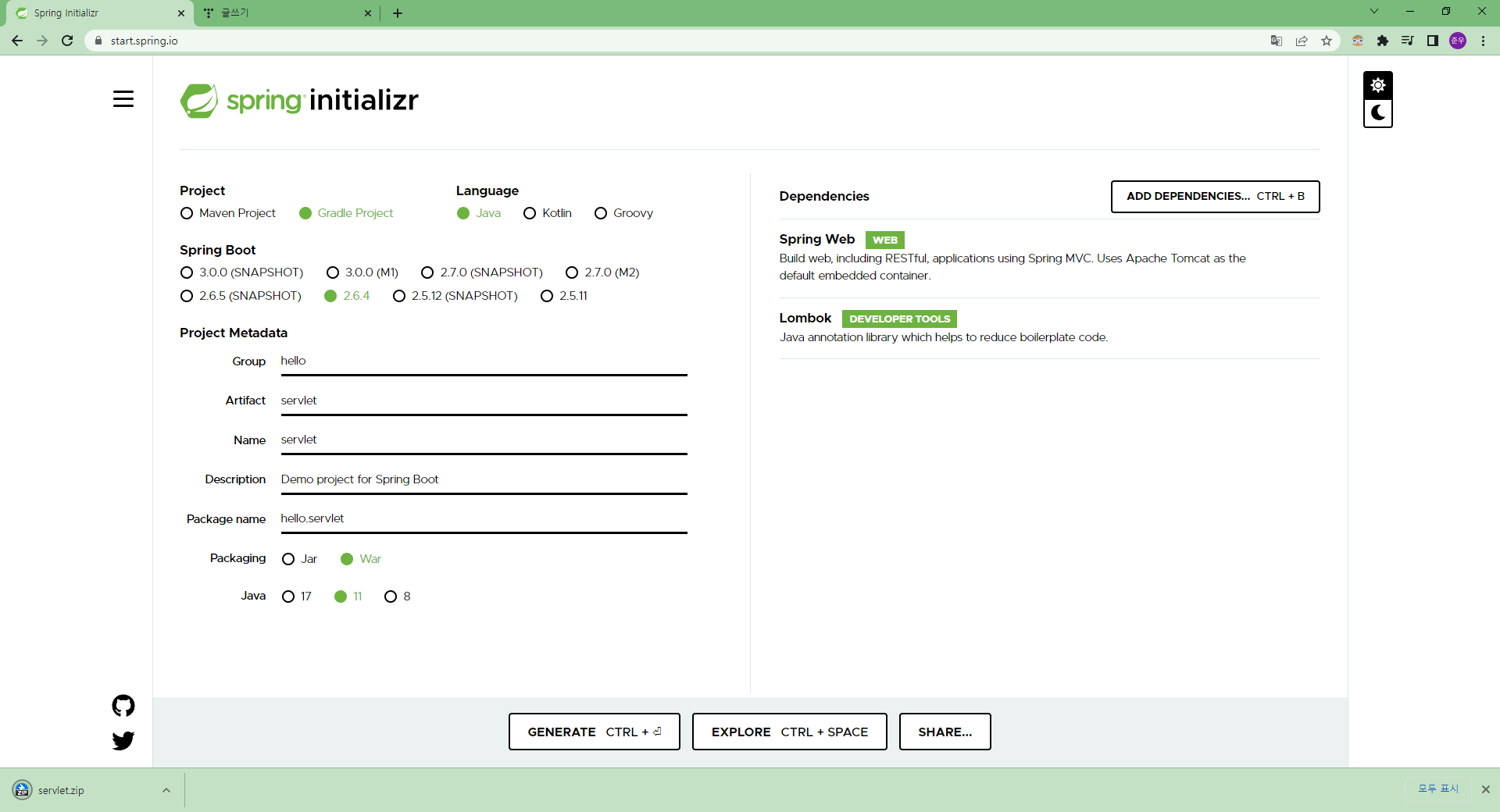 이제 스프링 스타터로 가서 프로젝트를 만들어 보겠습니다.