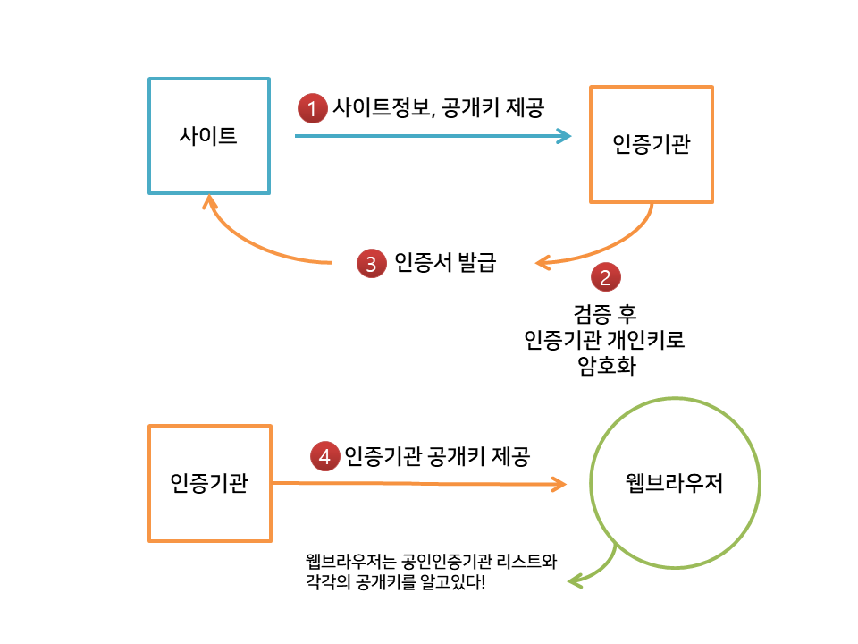 2. 이때, 계약을 완료한 인증 기관은 기관만의 공개키와 개인키가 있습니다. 인증기관은 사이트가 제출한 데이터를 검증하고, 인증 기관의 개인키로 사이트에서 제출한 정보를 암호화하여 인증서로 만들어 제공합니다.