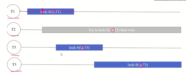 Exclusive lock과 shared Lock의 차이점 때문에 T2는 영원히 접근을 못할 수도 있음