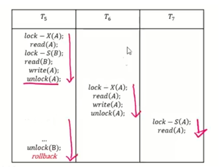 T5 가 rollback 되면 T6, T7 도 rollback 되어야 하기 때문에 Cascading rollback이 발생함.