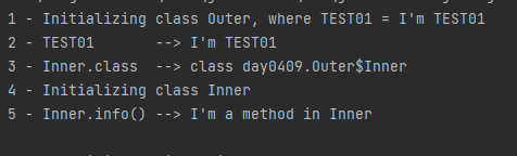 public class Outer { private static final String TEST01 = "I'm TEST01"; static { System.out.println("1 - Initializing class Outer, where TEST01 = " + TEST01); } public static void main(String[] args) { System.out.println("2 - TEST01 --> " + TEST01 ); System.out.println("3 - Inner.class --> " + Inner.class); System.out.println("5 - Inner.info() --> " + Inner.info() ); } private static class Inner { static { System.out.println("4 - Initializing class Inner"); } public static String info() { return "I'm a method in Inner"; } } }결과