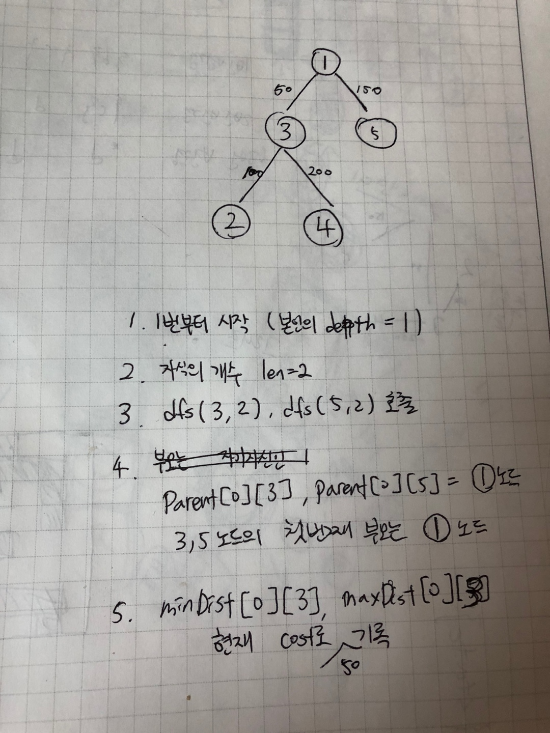 // DEPTH 확인 DFS static void dfs(int id, int cnt) { // 1. depth를 기록 depth[id] = cnt; // 2. 자식들의 depth를 기록 int len = tree[id].size(); for (int i = 0; i < len; i++) { edge next = (edge) tree[id].get(i); if (depth[next.target] != 0) { continue; } // 아직 깊이를 모르면 → 미방문 노드 dfs(next.target, cnt+1); parent[0][next.target] = id; // 첫번째 부모를 기록 minDist[0][next.target] = next.cost; // 현재 cost로 갱신 maxDist[0][next.target] = next.cost; // 현재 cost로 갱신 } return; }
