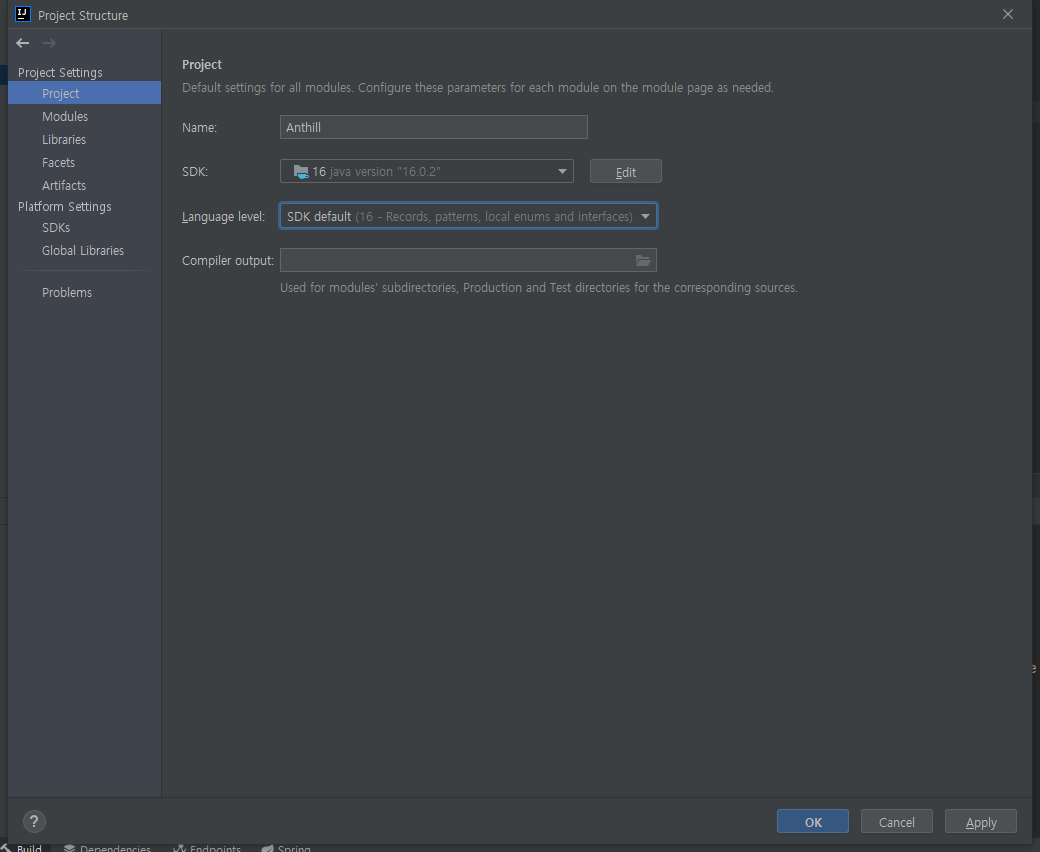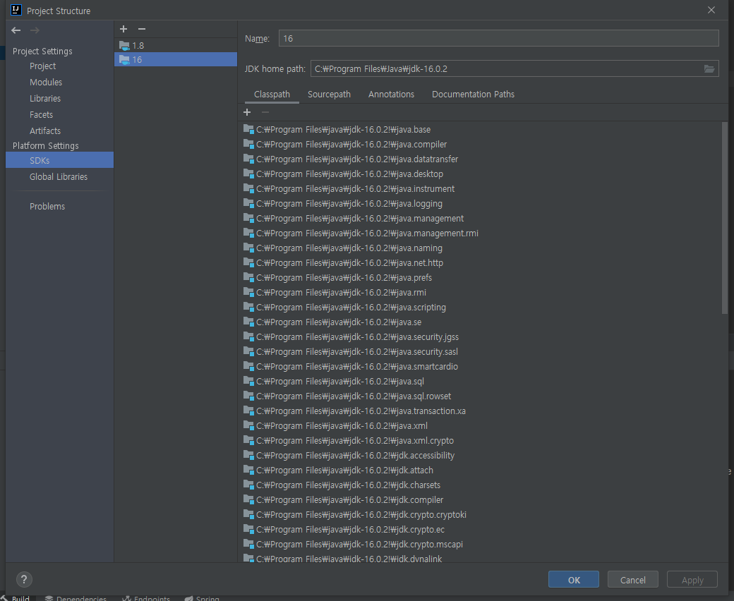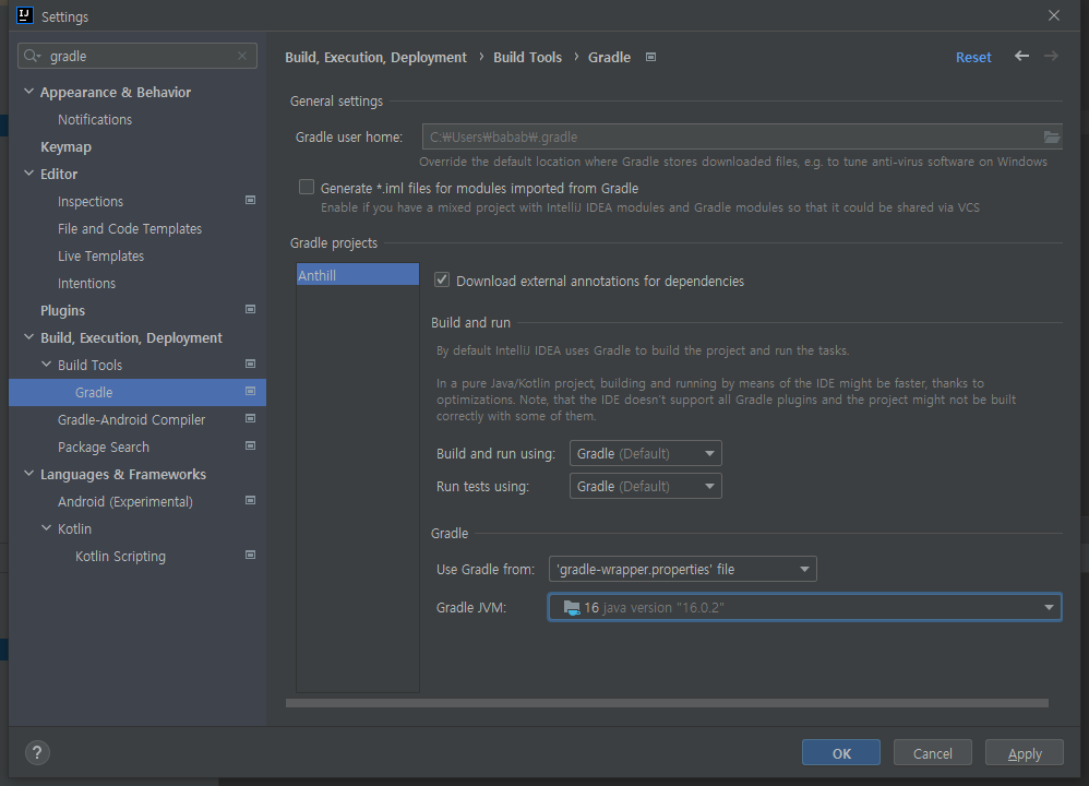 이후에 Gradle JVM에 JAVA_HOME을 java 16 버전으로 바꿔주겠습니다
