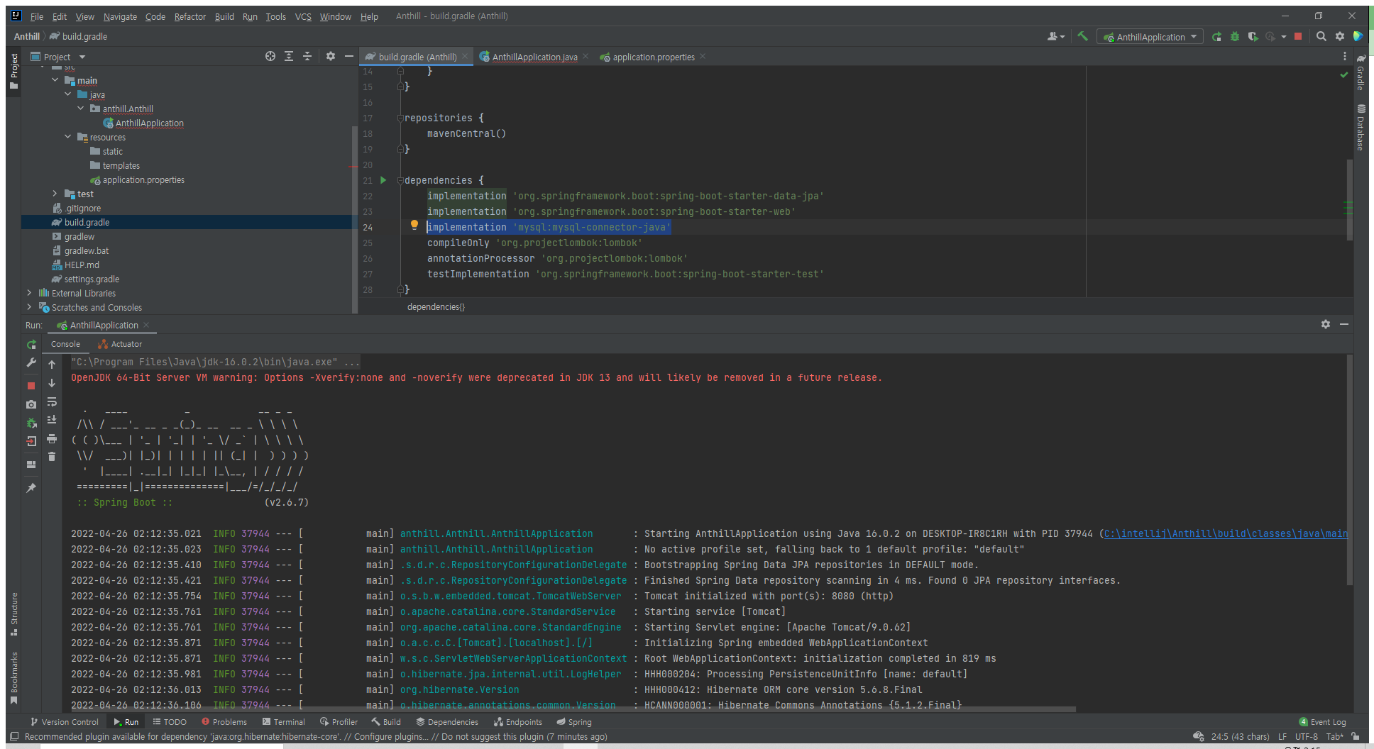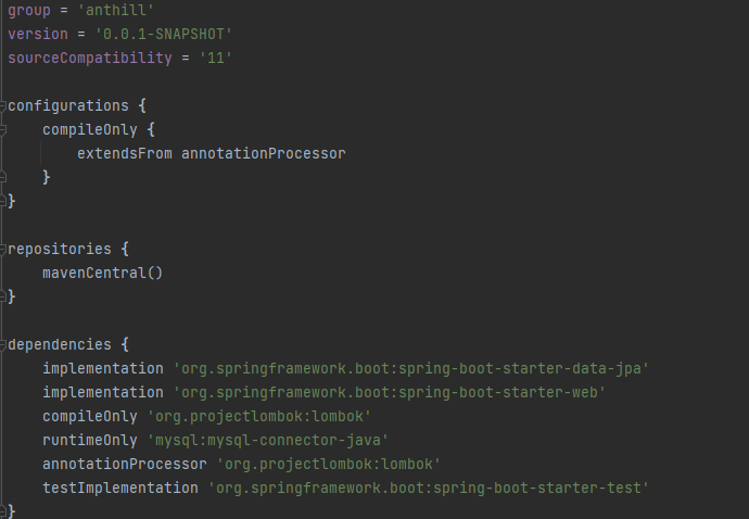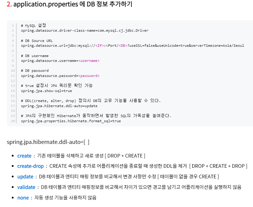 spring.datasource.driver-class-name=com.mysql.cj.jdbc.Driver spring.datasource.url=jdbc:mysql://localhost:3306/yourDBName?useSSL=false&useUnicode=true&serverTimezone=Asia/Seoul spring.datasource.username=yourname spring.datasource.password=yourpassword spring.jpa.show-sql=true spring.jpa.hibernate.ddl-auto=update spring.jpa.properties.hibernate.format_sql=true이때 build.gradle에는 원래 mysql 종속성을 제거하고 다음 종속성을 추가해줬습니다. (application.properties에서 에러가 발생했음)