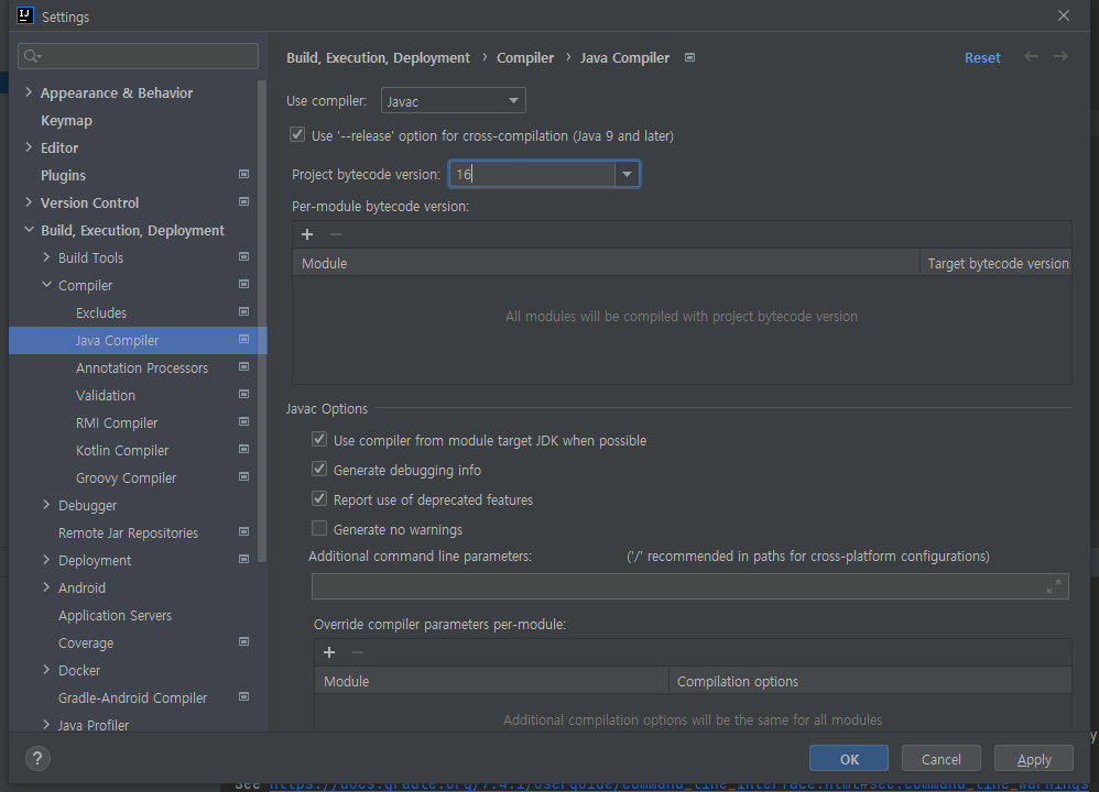 File -> Settings -> Build, Excution, Deployment -> Java Compiler -> Project bytecode version -> 11 -> 16으로 변경