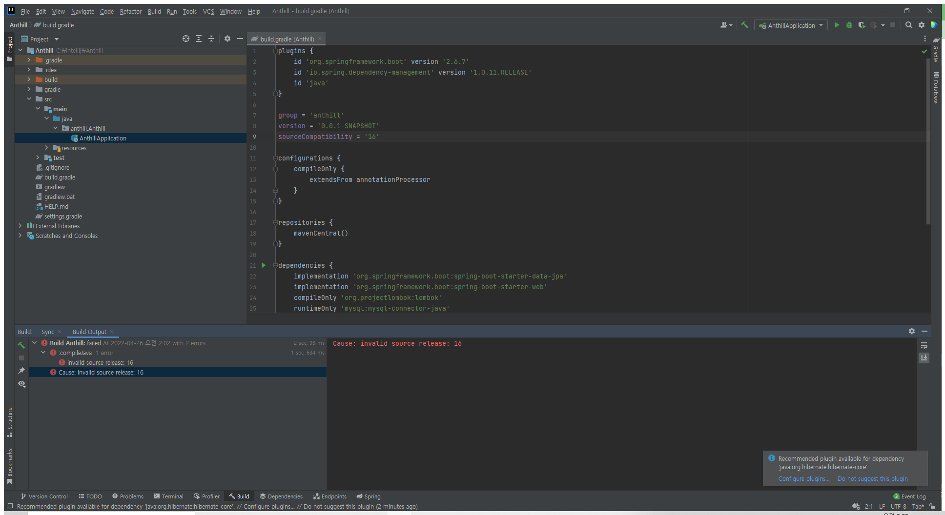build.gradle 저는 Java16을 사용하고 있어서 sourceCompatibility = 16으로 수정하겠습니다.