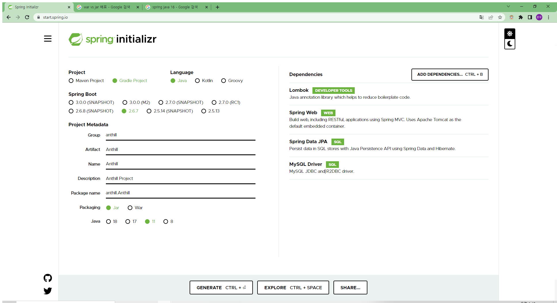 https://start.spring.io/ 이제 하단의 GENERATE를 눌러보겠습니다.