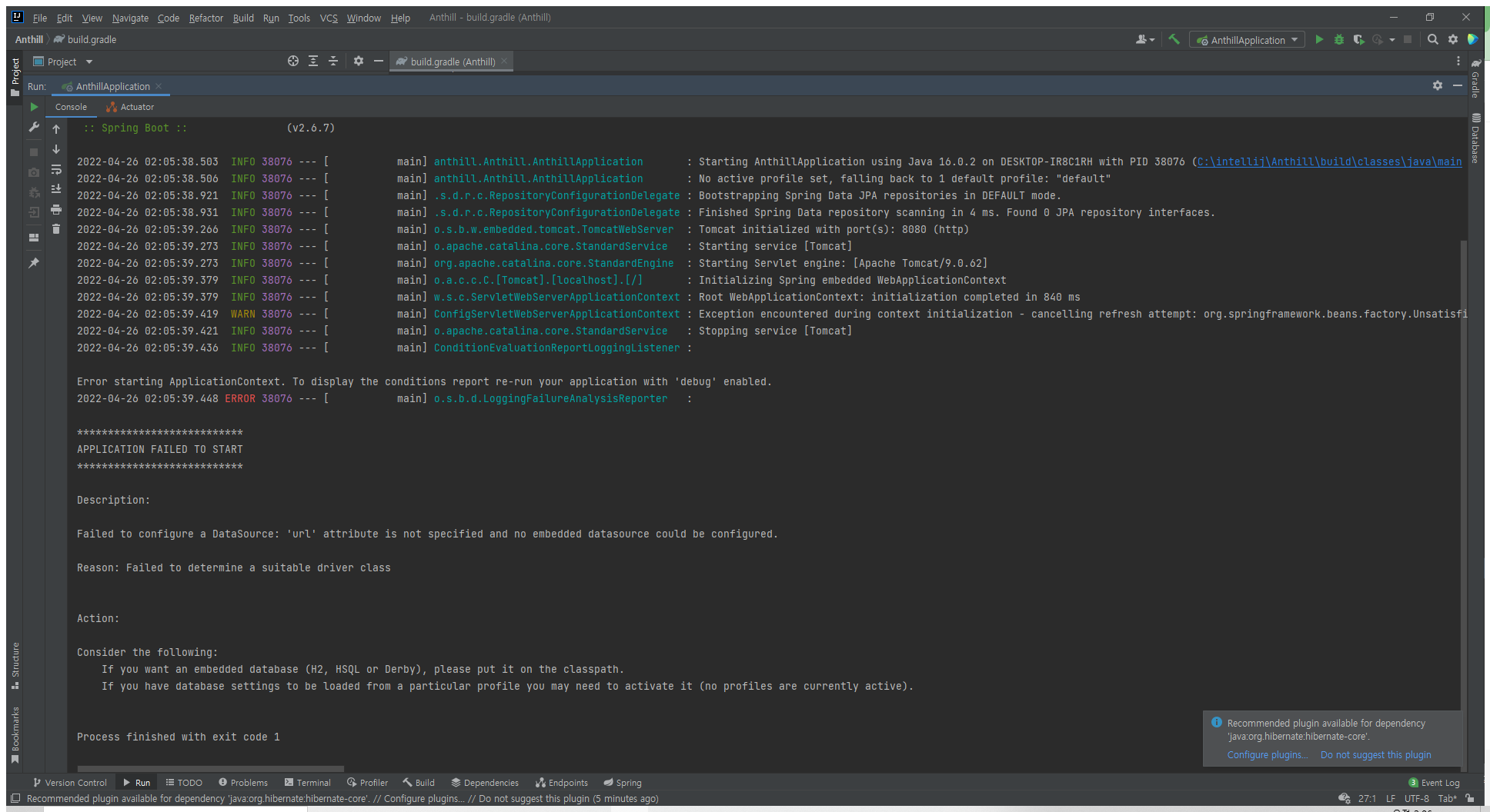 하지만 DataSource를 configure 하는데 실패했다고 합니다.