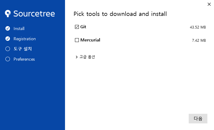 5. 'Mercurial'도 같이 설치할지를 선택합니다. 'Mercurial'은 Git과 비슷한 툴인데 필요하지 않기 때문에 체크하지 않겠습니다.
