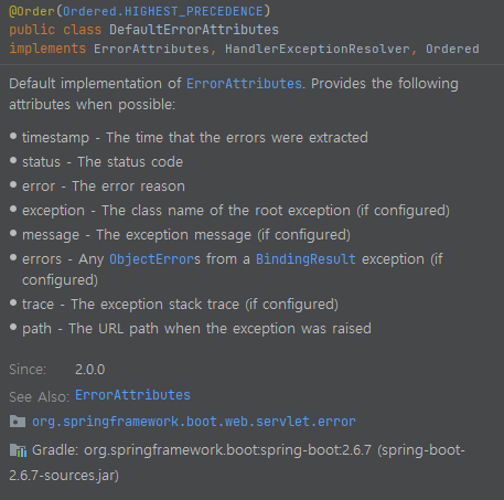 - DefaultErrorAttributes : 에러 속성을 저장하며 직접 예외를 처리하지는 않는다.