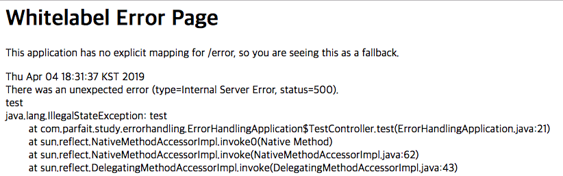 { "timestamp": "2019-04-04T09:31:27.931+0000", "status": 500, "error": "Internal Server Error", "exception": "java.lang.IllegalStateException", "message": "test", "trace": "java.lang.IllegalStateException: test ...(길어서 줄임)", "path": "/rest-test" }물론 운영 환경에서 구현이 노출되는 trace는 제공하지 않는 것이 좋습니다.