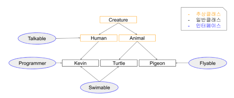 케빈과 거북이는 수영을 할 수 있다. (서로 다른 추상 클래스를 상속하지만 공통된 기능이 필요한 경우)