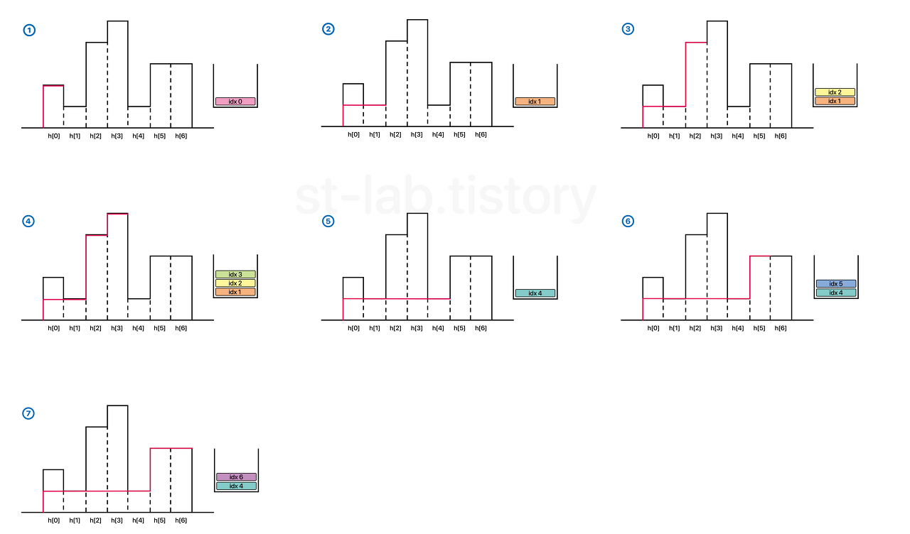 https://st-lab.tistory.com/255 현재 막대의 높이보다 크거나 같은 원소는 모두 삭제하고 그 다음 현재 막대의 index를 넣어주면 됩니다.