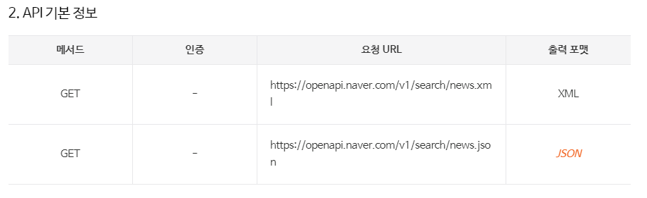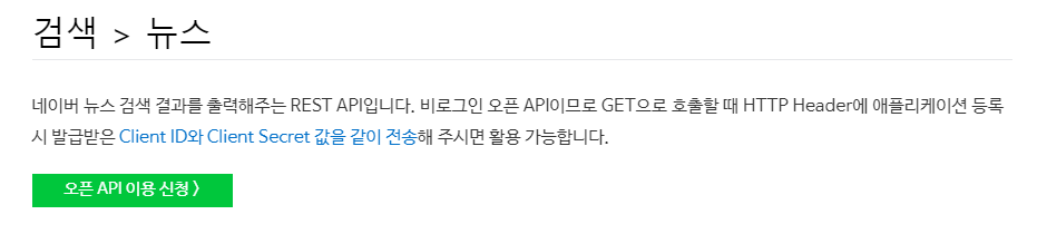 그러면 네이버 검색 API 중 뉴스 검색을 사용해 보겠습니다.