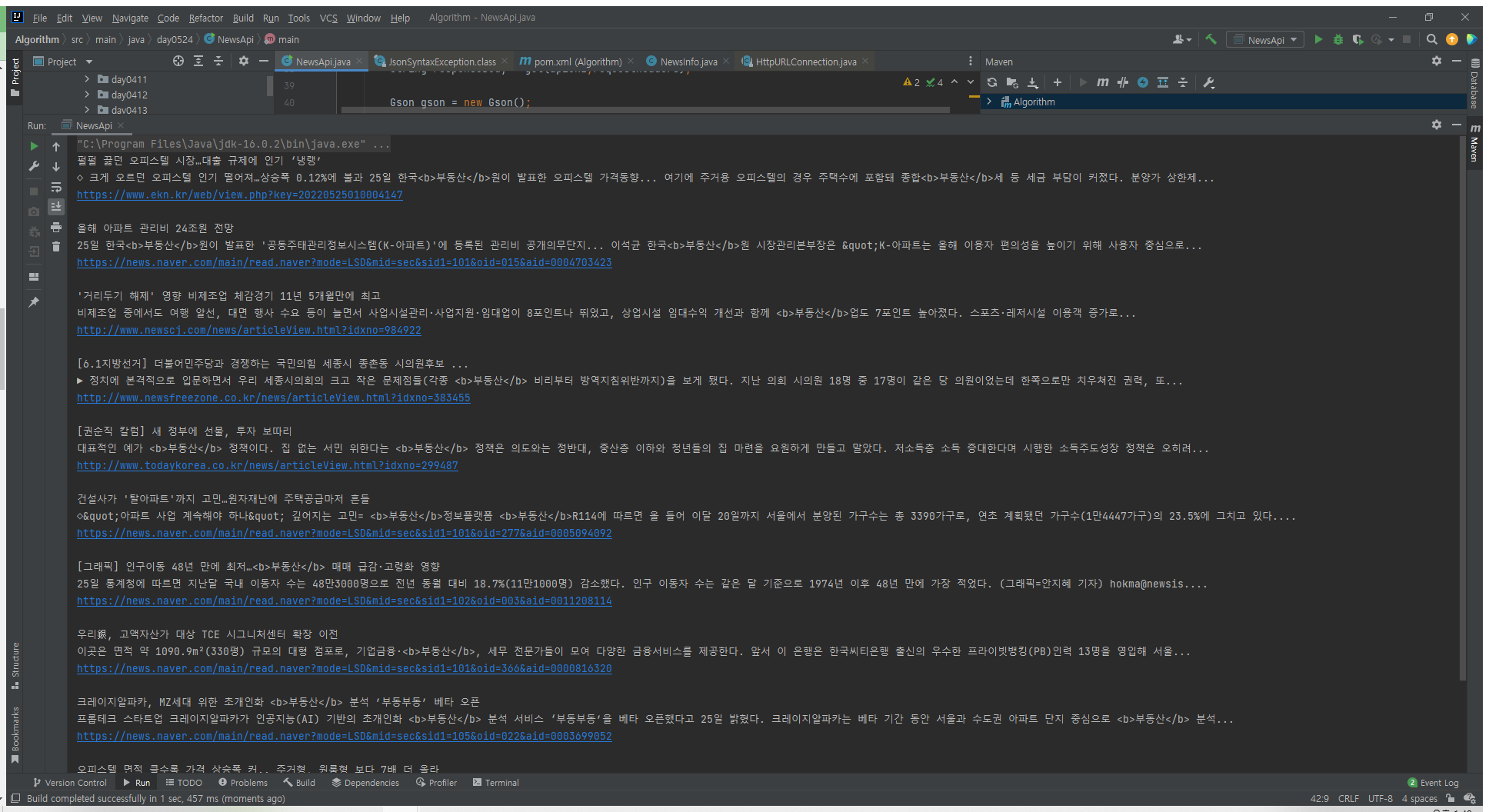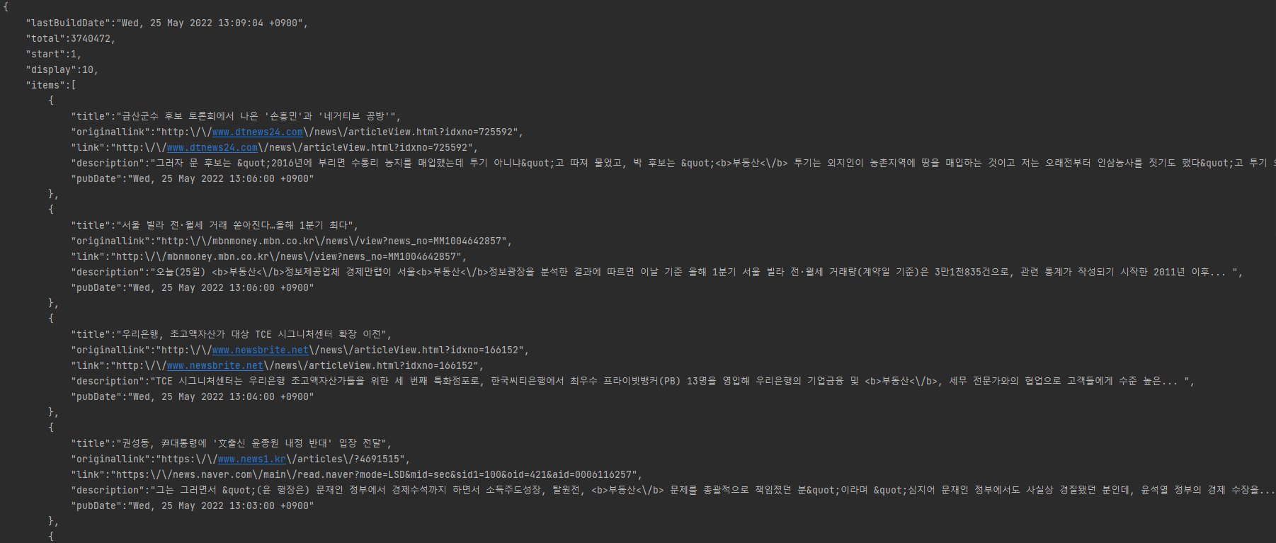 text = URLEncoder.encode("부동산", "UTF-8"); String apiURL = "https://openapi.naver.com/v1/search/news.json?query=" + text; // json 결과이제 실행해 보면 다음과 같은 결과를 얻을 수 있습니다.