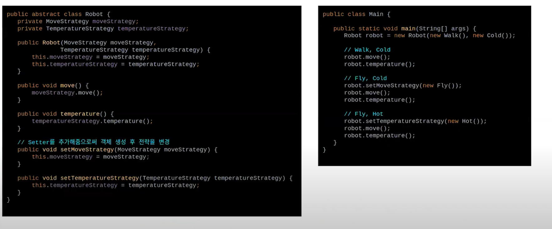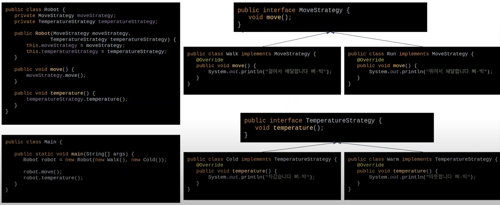 2. 로봇 클래스에 전략 인터페이스들을 필드로 가지고 이를 조립한다. (전략이 동적으로 수정이 가능해짐!)