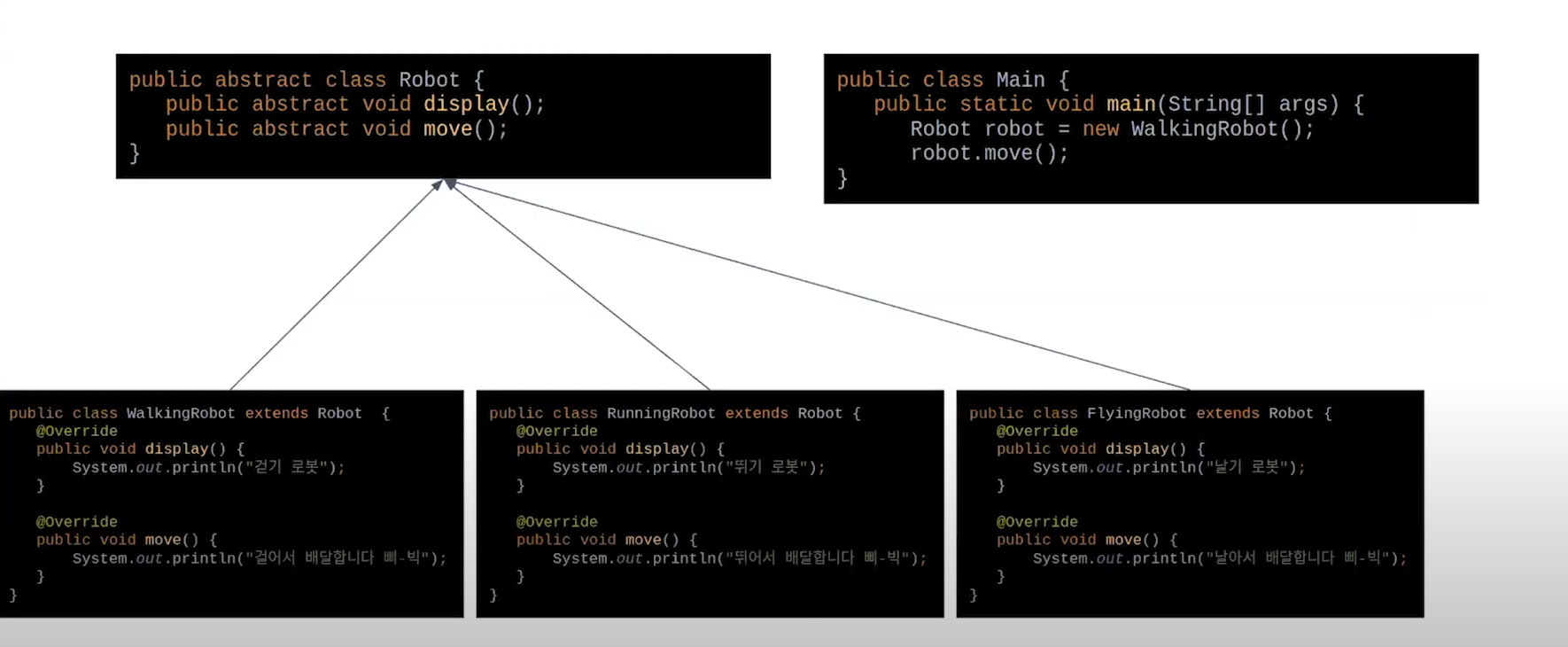 public class WalkingRobot{ public void display(){ System.out.println("걷기 로봇"); } public void move(){ System.out.println("걸어서 배달합니다."); } } public class RunningRobot{ public void display(){ System.out.println("뛰기 로봇"); } public void move(){ System.out.println("뛰어서 배달합니다."); } } public class main{ public static void main(String[] args){ WalkingRobot walkingRobot = new WalkingRobot(); RunningRobot runningRobot = new RunningRobot(); walkingRobot.move(); runningRobot.move(); } }여기에서 날아서 배달하는 로봇, 포켓으로 배달하는 로봇들이 등장할 수 있습니다.