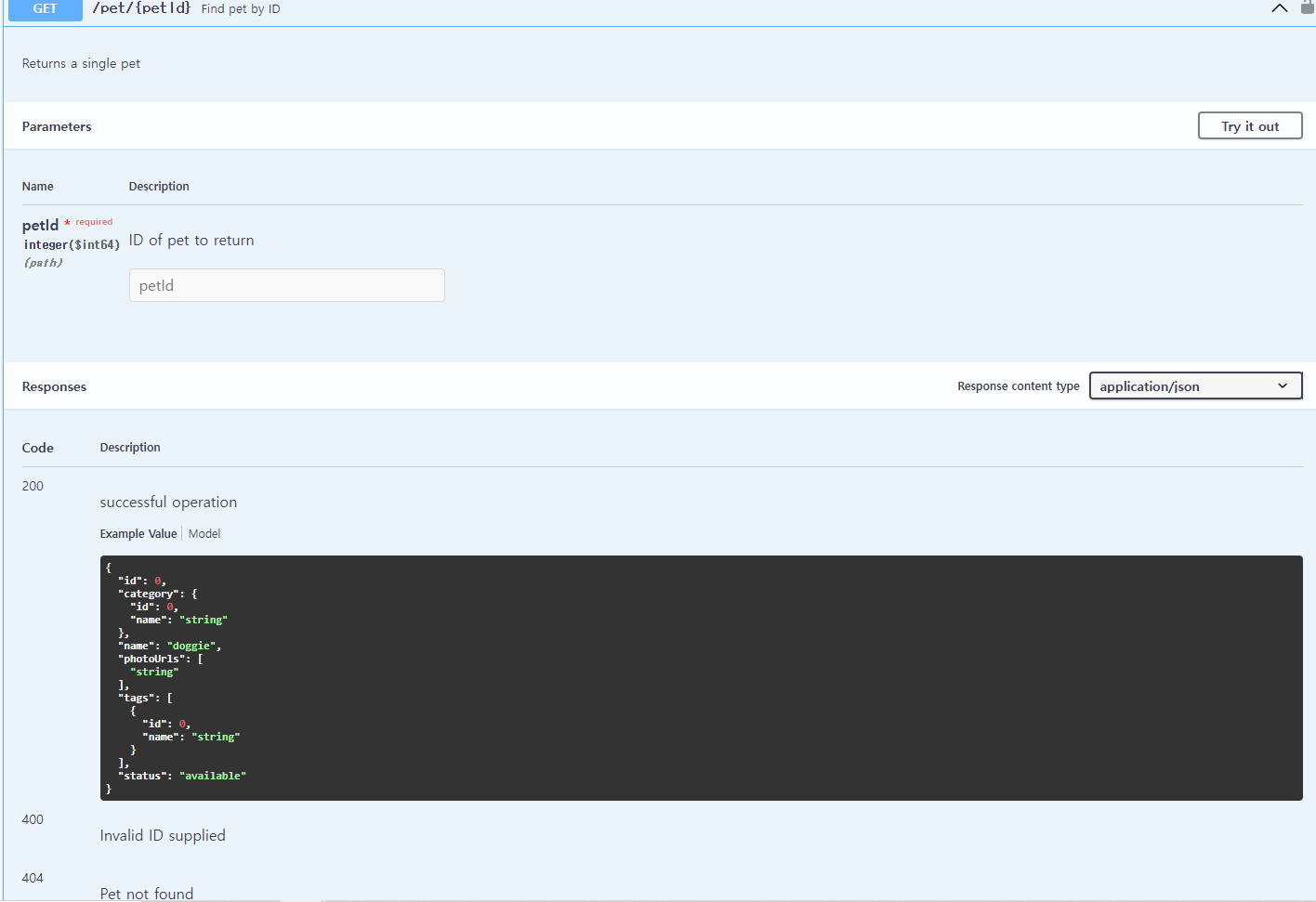 Responses(응답)은 200 suceessful operation, 400 Invalid ID supplied, 404 Pet not found가 존재합니다.