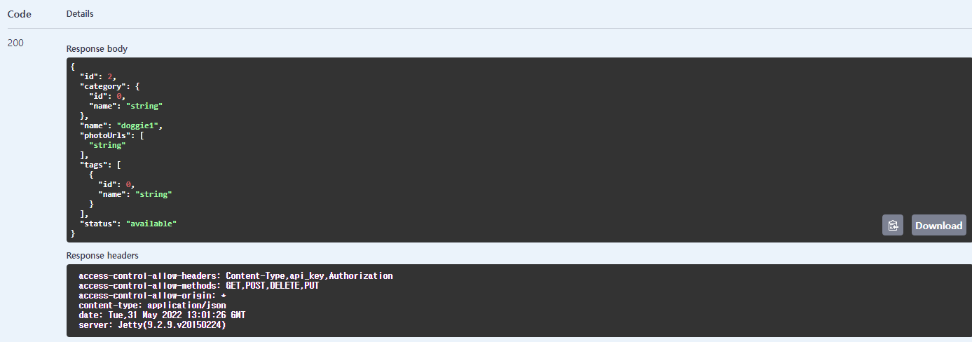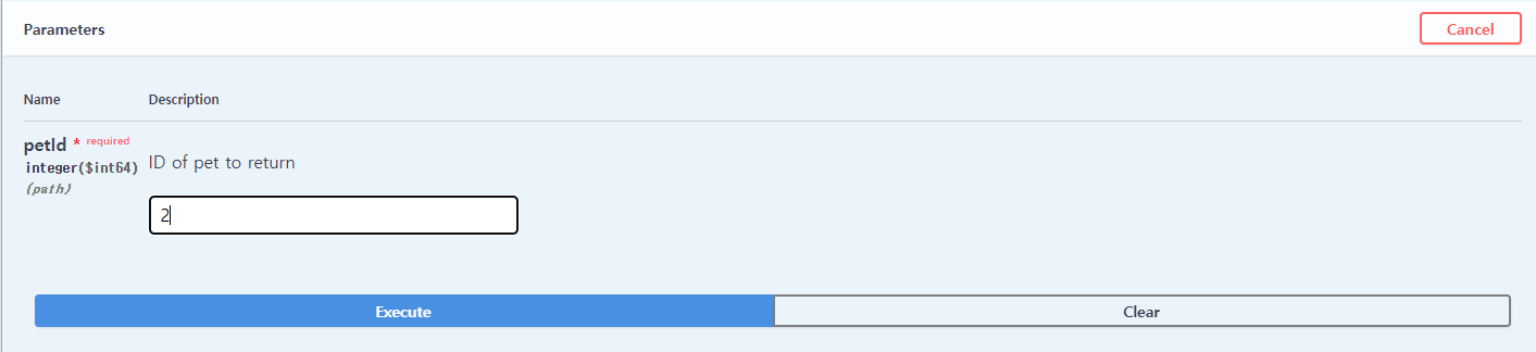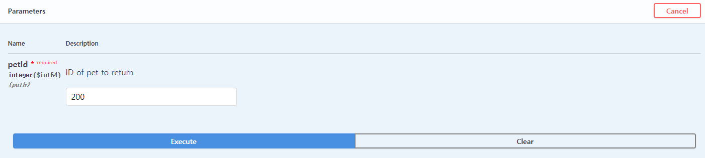 그리고 Parameters(인자)로는 petID가 주어지고 이는 Integer값입니다.