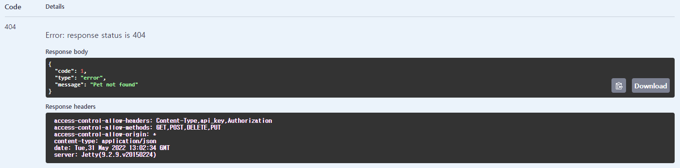 404 Not Found 발생 이번에는 200에 해당하는 pet이 존재하지 않아 404 에러가 발생하였습니다.