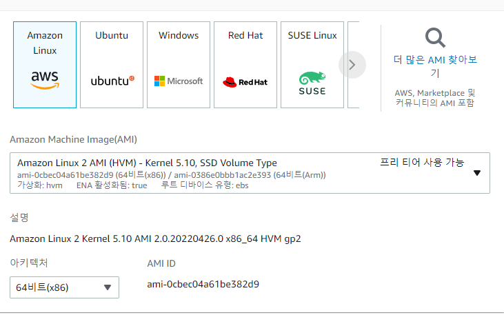Amazon Linux 2 AMI Kernel 5.10과 4.14 버전이 있었는데 5.10을 선택했습니다.