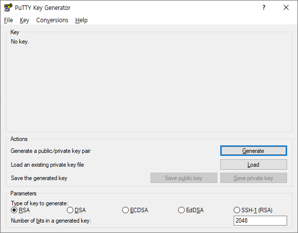 puttygen Conversions -> Import Key를 선택해서 내려받은 pem을 선택합니다.