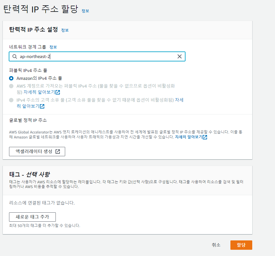 탄력적 주소를 생성해주고 할당된 주소를 클릭하면 오렌지색의 탄력적 IP 주소 연결을 눌러줍니다.
