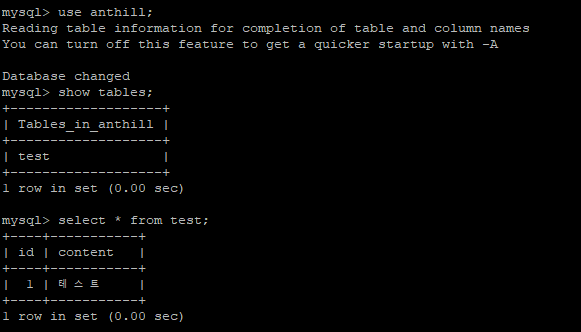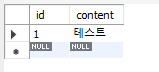 CREATE TABLE test( id bigint(20) NOT NULL AUTO_INCREMENT, content varchar(255) DEFAULT NULL, PRIMARY KEY(id) )ENGINE=InnoDB; insert into test(content) values ('테스트'); select * from test;간단하게 테이블을 생성하고 한글명이 잘 들어가는지 테스트하겠습니다.