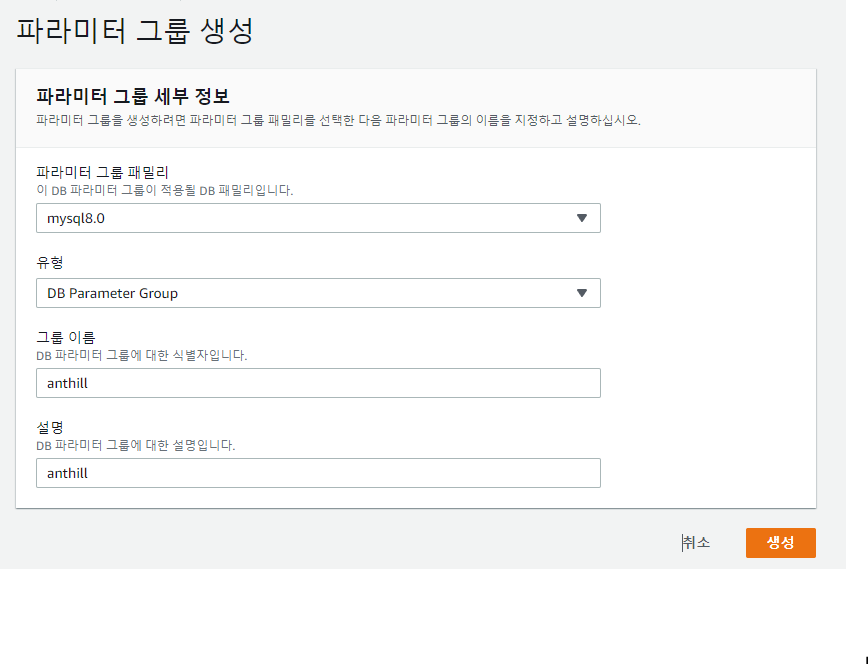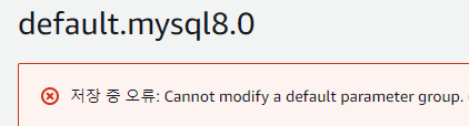 default 파라미터 그룹은 수정할 수 없도록 되어 있기 때문에 새로운 파라미터 그룹을 생성한 다음 설정을 변경해야 합니다.
