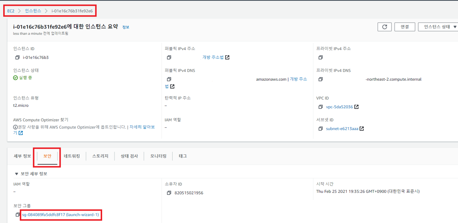1.EC2 -> 인스턴스 -> 보안 -> 설정되어 있는 보안 그룹 선택