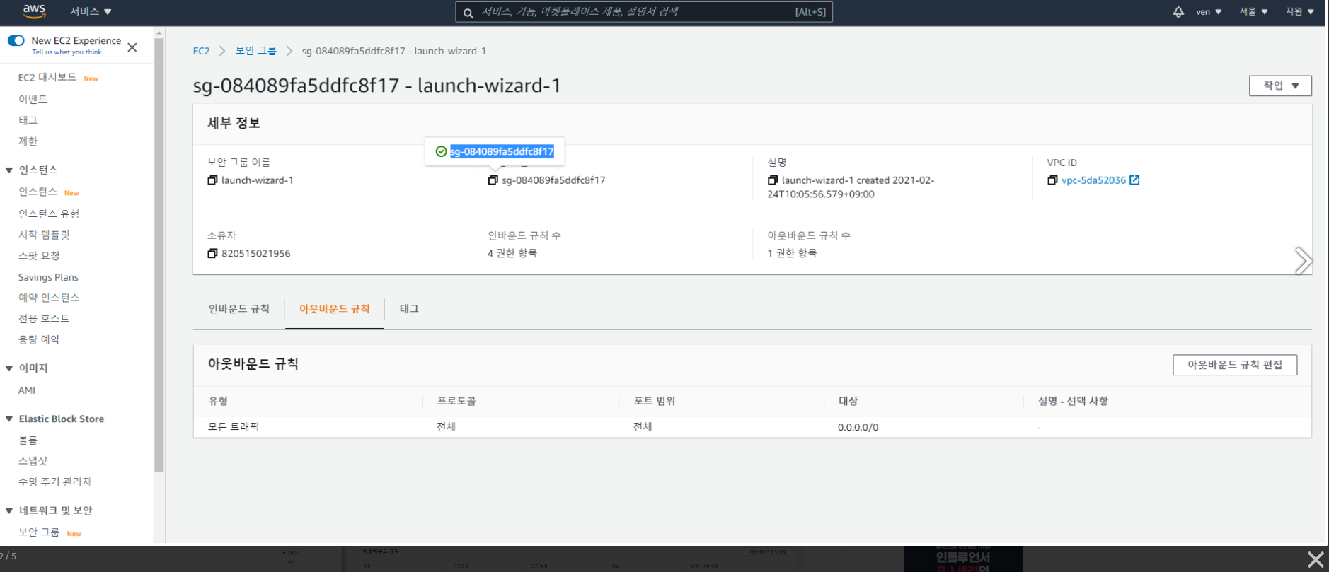 그러면 EC2 Management Consolg창으로 이동하며 보안 그룹이 보입니다.