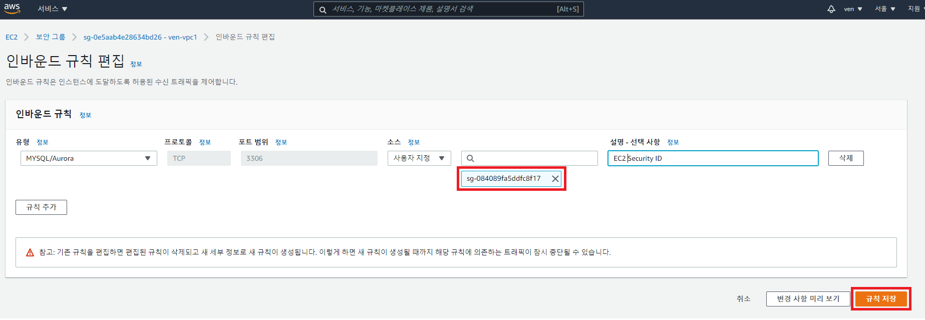 4-2. 복사한 EC2 보안 그룹 ID를 인바운트 규칙에 추가 후 저장