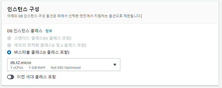 인스턴스 구성은 가장 낮은 가격인 db.t2.micro를 선택했습니다.