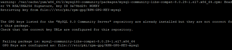 yum install mysql-community-server만약 다음과 같은 에러가 발생한다면 다음 명령어를 입력해주세요