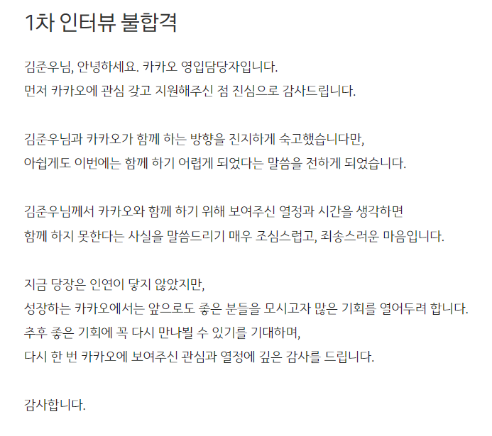 https://tech.kakao.com/2022/04/19/2022-kakao-tech-internship-server/ 그리고 처음에는 긴장이 많이 되었지만 면접 봐주신 면접관분들이 너무 친절하셔서 금방 긴장감이 풀렸던 것 같습니다.