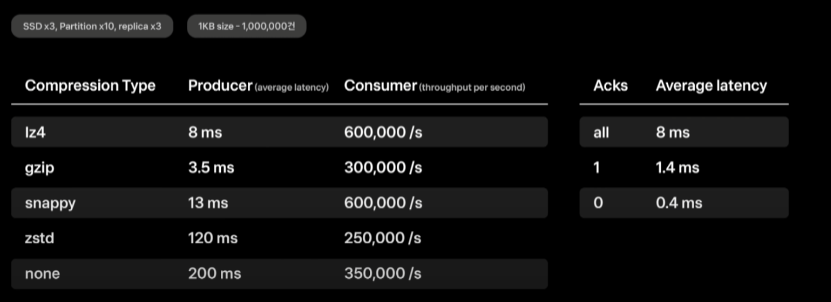 지연속도 개선을 위해 설정값으로 튜닝할 수 있는 요소는 compression type과 acks 2가지가 있습니다.