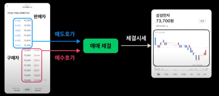 이를 "주문호가"라고 하는데 주문 호가 중 일치하는 상대 주문이 존재하는 경우에 거래가 체결됩니다.
