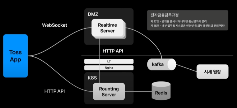 전자금융 감독규정의 망분리 요건을 준수하기 위해, WebSocket 서버 상단의 네트워크 홉을 줄이기 위하여 위와 같은 인프라 구조를 채택하였습니다.