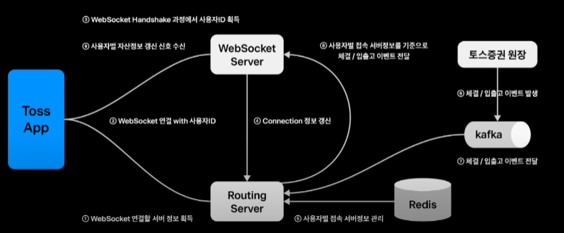 라우팅 서버는 사용자별 접속 정보를 기준으로 실제 사용자가 연결된 웹소켓 서버에 해당 정보를 포워딩하게 됩니다.