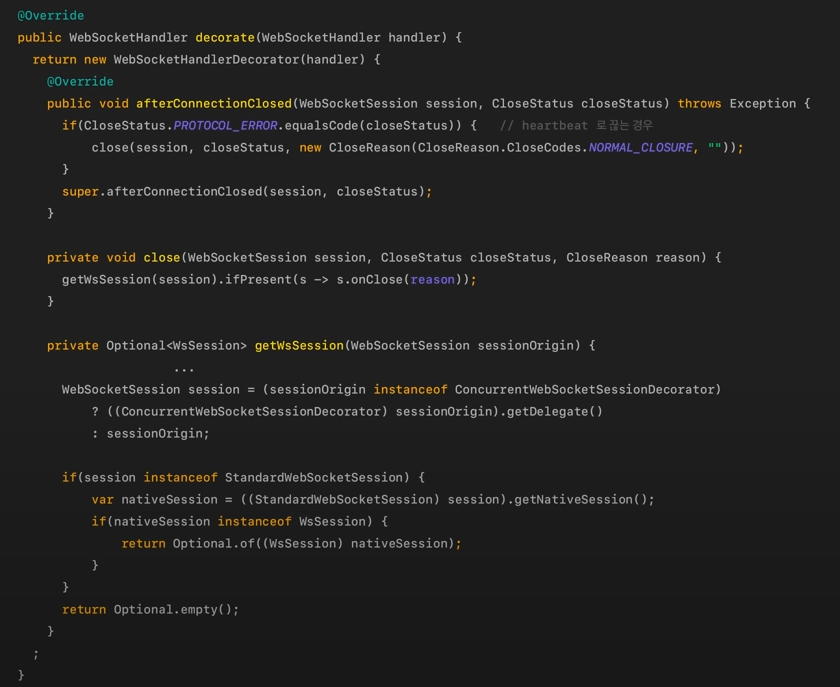Spring WebSocket의 close 이벤트를 디버깅해보니 정상 종료 시에는 문제가 없었지만 비이상적인 이벤트 발생 시에 웹소켓이 정상적으로 종료되지 않는 현상을 확인할 수 있었습니다.