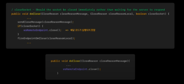 doClose 메서드의 closeSocket option이 false로 실행되는 것이 실제 문제의 원인입니다.