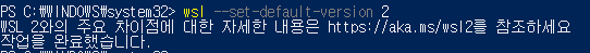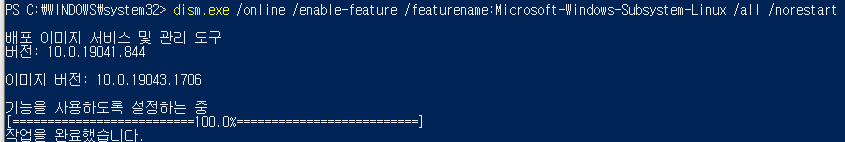 DISM(배포 이미지 서비스 및 관리) 명령어로 Micorosofy-Windows-Subsystem-Linux 기능을 활성화합니다.
