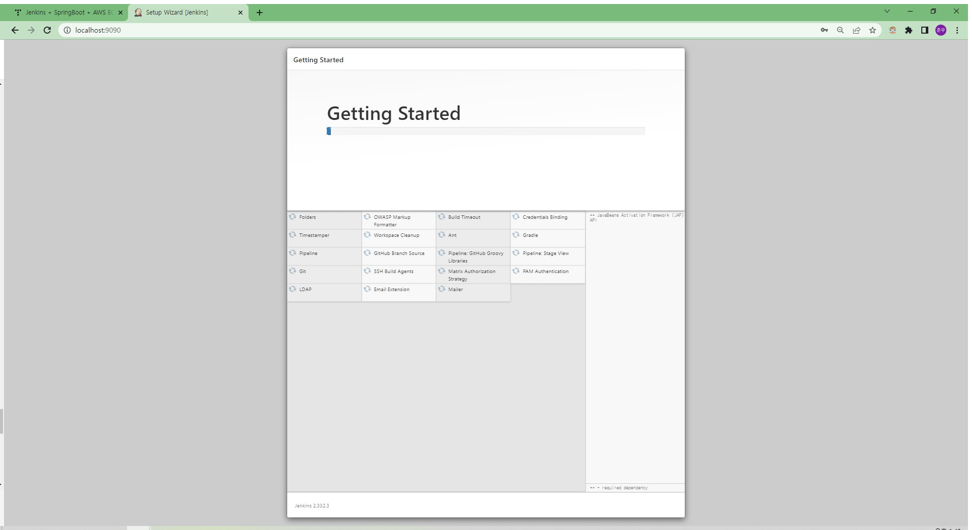 localhost:9090에 접속하고 jenkins 비밀번호를 입력합니다.