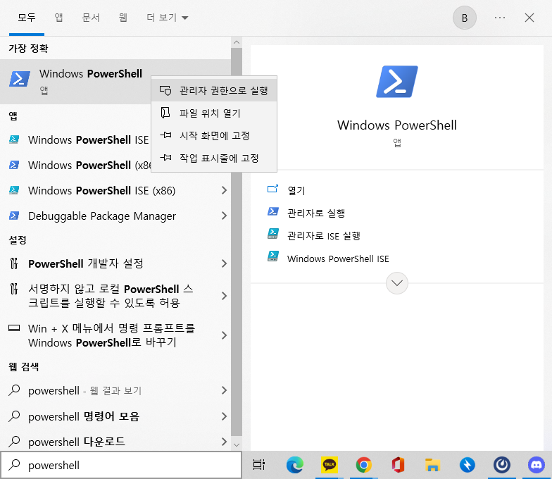 PowerShell 같은 경우는 별도의 설치가 필요 없는 것 같아 PowerShell을 관리자 권한으로 실행하겠습니다.