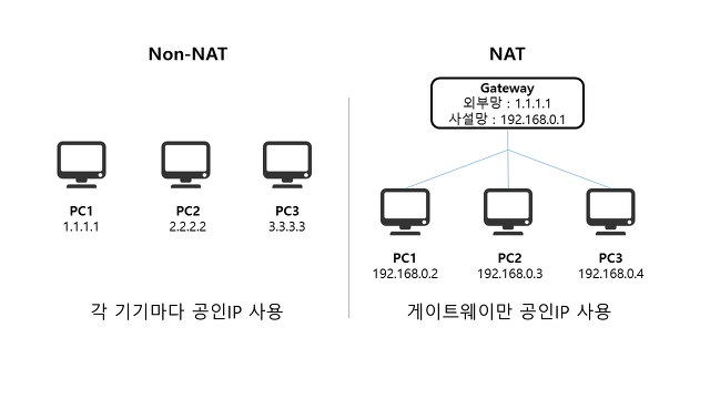이런 일을 해결하고자 공용 IP를 두고 공용 IP가 사설 IP들을 관리하는 식으로 구성하여 부족 현상을 개선하고자 했습니다.