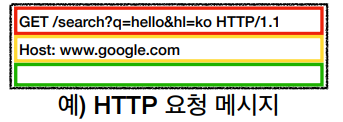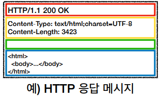 빨간색 부분은 start-line, 노란색 부분은 header, 초록색 부분은 empty line, 파란색 부분은 message body를 의미합니다.